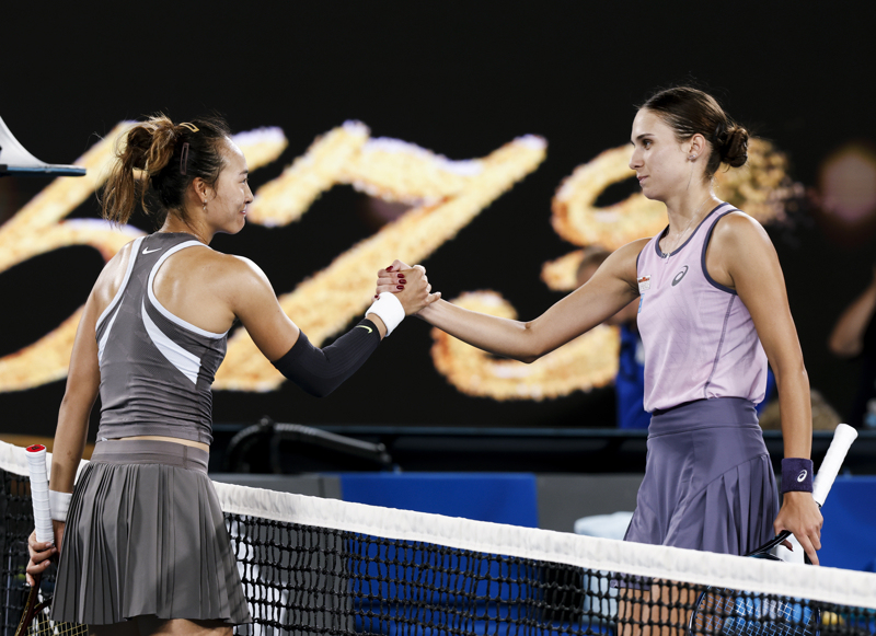 1月12日,郑钦文(左)与托多尼赛后握手致意。新华社记者 马平 摄